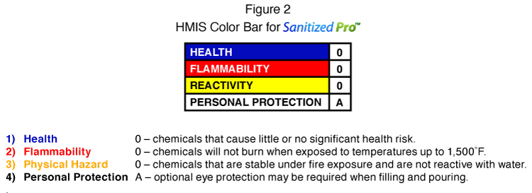 The second standard is maintained by the Hazardous Materials Identification System (HMIS) that features a numerical hazard rating that incorporates the use of labels with color developed by the American Coatings Association as a compliance aid for the OSHA Hazard Communication (HazCom) Standard. The HMIS Color Bar is similar to the NFPA 704 fire diamond. The color bar is not for emergencies and is used to convey broader health warning information. The four bars are color-coded categories for chemical substances, using the modern color bar symbols with blue indicating the level of health hazard, red for flammability, orange or yellow for a physical hazard or reactivity, and white for Personal Protection. The number ratings range from 0 (no hazard) to 4 (severe hazard). SanitizedPro™ has the following HMIS ratings: